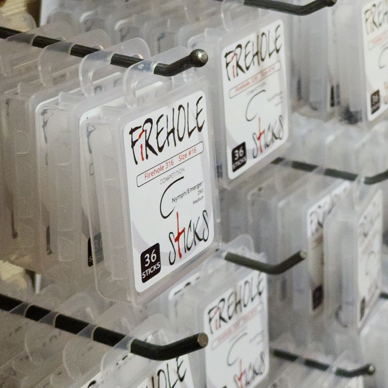 Currently, all Firehole Sticks & Stones are packaged in a polypropylene plastic box (2.4" x 1.8" x 0.6") which is designed so that boxes can be connected together side-by-side for storage purposes for the consumer. Each box contains 36 individual hooks or beads unless otherwise noted. Each box is labeled front and back. The front label of Firehole Sticks indicates the hook model, size, shape and sizing descriptors. The front label for Firehole Stones indicates bead type, color, size, and suggested hook size reference. The back label of both Sticks and Stones has characteristic information.