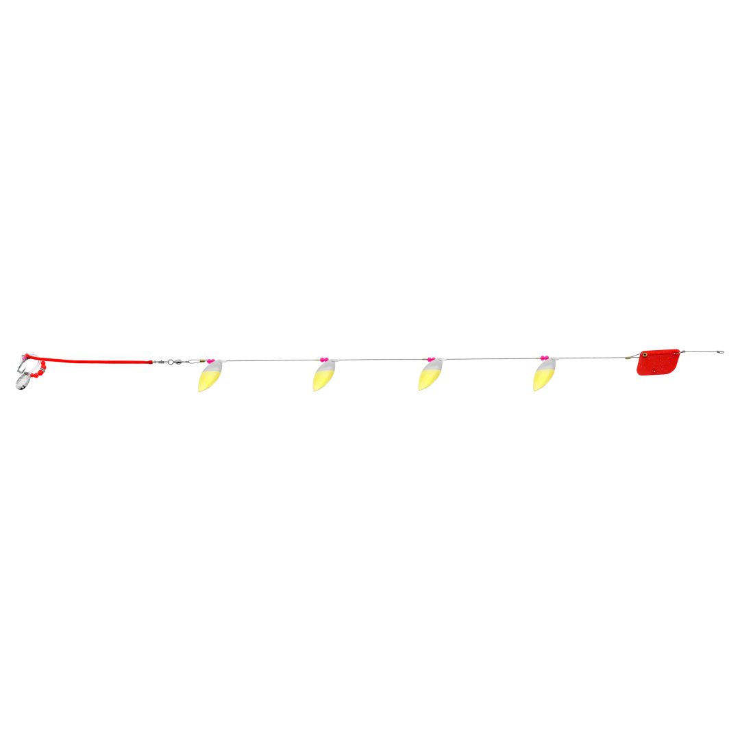 The great reflecting surface of the long tapered blades on the Gibbs Kokanee Katcher makes it very popular for lake fishing. Combined with three coloured beads and available in two different sizes this troll is highly effective. Comes ready to fish with a wedding band spinning lure and rubber snubber.