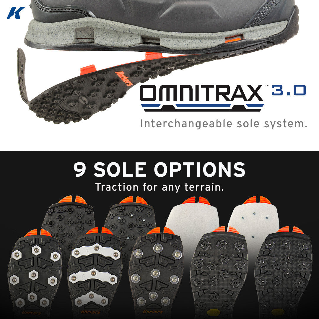 OmniTrax® Interchangeable Sole System – Easily swap between felt and Kling-On® rubber for customized traction