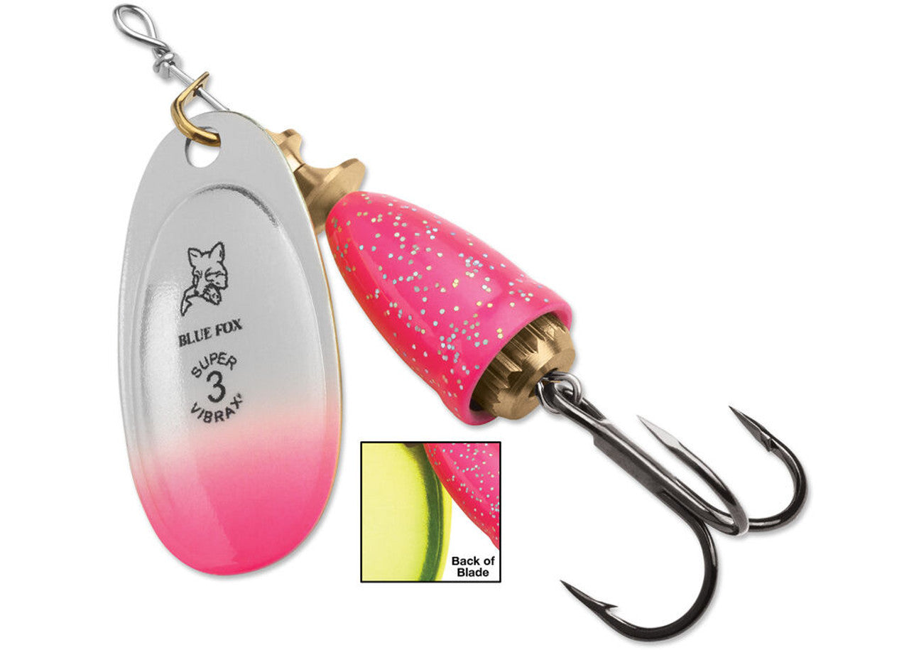 The Classic Vibrax® gets a tasty candyback! Colored bell is accented with metallic flecks. Blade is tipped in matching color, while blade back is finished with transparent, fluorescent coordinating color. Flaw-free silver plating, fine tolerances and super-sharp hooks are long-standing features of this low frequency emitting patented two-part body spinner.