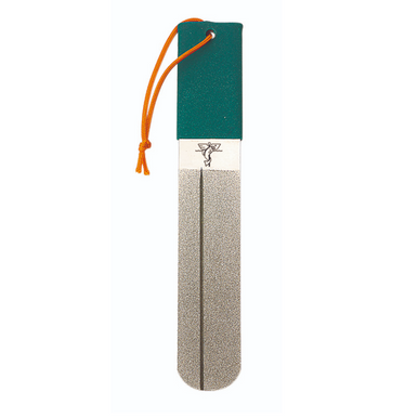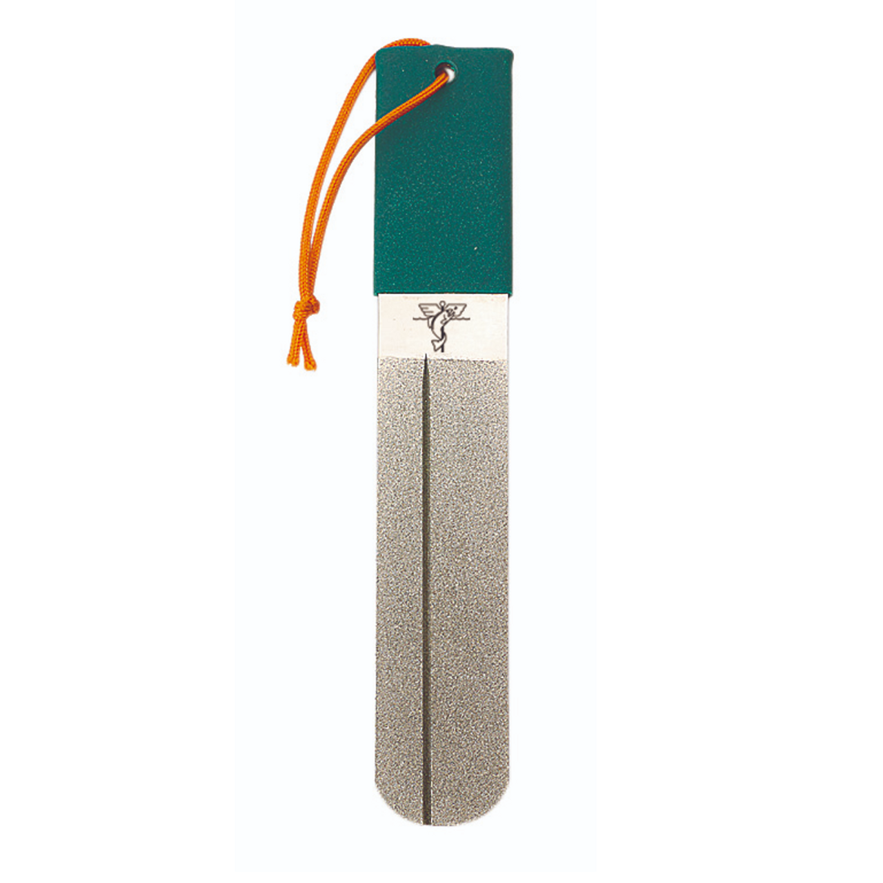 Constructed of stainless steel with dual diamond grit surfaces. 4-Inch model has a fine side - 600 grit, and a medium side - 300 grit. 6-Inch model has a medium side - 300 grit, and heavy side - 150 grit.