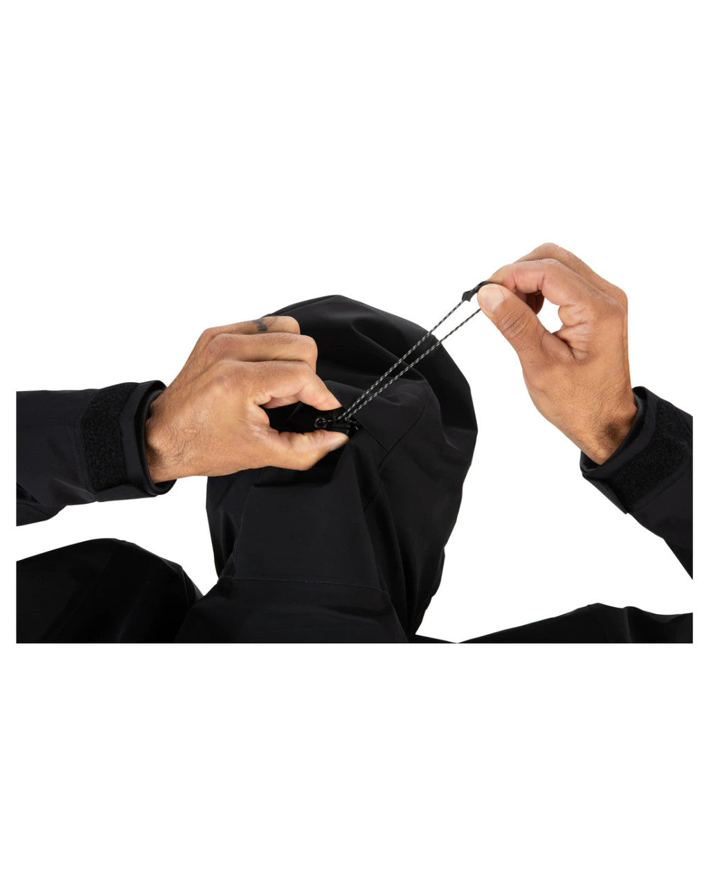 • Single point adjustable storm hood with high collar and bonded brim to shed rain