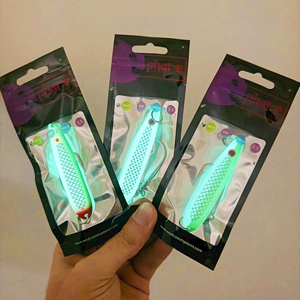 The blank has been constructed with 304 stainless steel, then electroplated with chrome, and the glow spoons are all double sided. This provides the rigidity and strength in the spoon to withstand the bending or twisting and a super shiny surface that sparkles in the water or glows down deep. The proprietary UV Clear Coat doubles the glow intensity and for the non glow spoons they give off a clear purple luminescence for a life like appearance.
